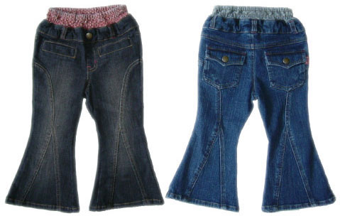 なんと言っても総ゴムではき易いのがうれしいFOキッズのスーパーブーツカットのデニムパンツです。 ウエスト部分は布の切り替えになっていて、はくとローライズパンツをはいているような感じになります。男女兼用。