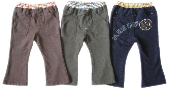 素材がカチオンなので柔らかくはきやすい、しかもウエストは総ゴム。ウエストの切り替えのボーダープリントもおしゃれです。ポケットがたっぷりついています。パックのピースサインのアップリケプリントがかわいい。男女兼用。