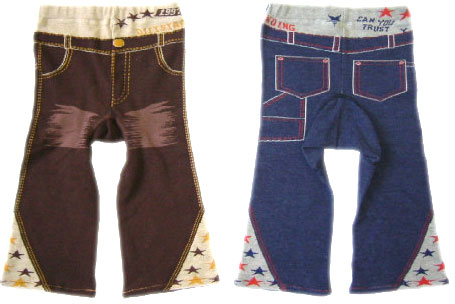 ソフトタッチで、伸縮性のある素材なので小さいお子様におすすめ。タイツを厚手にしたような素材なのでオムツの上からも楽に着せられます。ローライズ風にみえるプリントのステッチと裾の星柄がユニーク。ポケットにみえるのも実はスパッツの柄です。