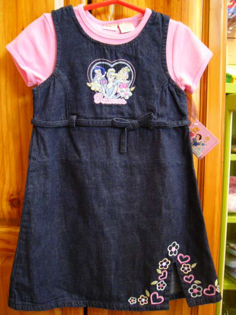デニムのジャンバースカートとピンクのTシャツセットです。プリンセスは刺繍です。スカートのすそにも刺繍が入っていてきれいです。
