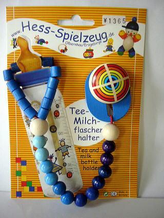 ドイツのロレンツ社。安全な塗料を使用した木のボトルホルダーです。クリップも木でできていて金属を使っていません。これを使えば哺乳瓶が床に落ちないので安心です