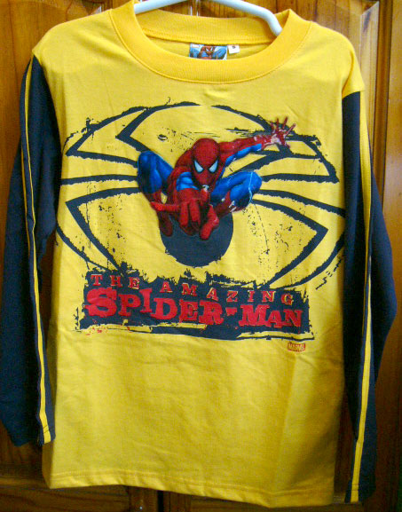 ボディの色はイエロー、袖がネイビー。バック腰あたりにプリントがあります。とにかくかっこいい。スパイダーマンファンの男の子にぜひ!