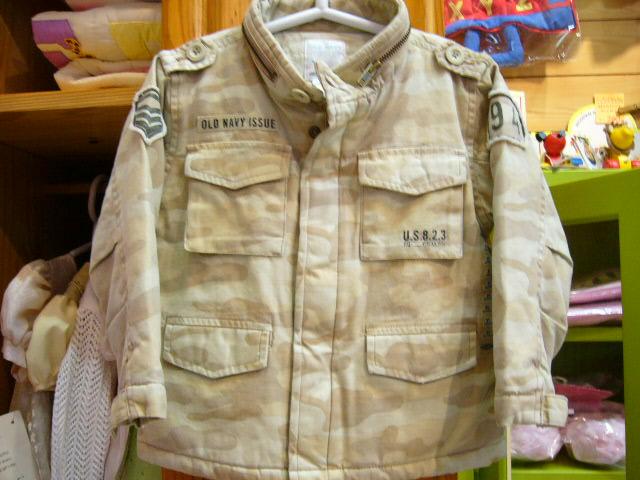 薄い色合いの迷彩柄ミリタリージャケットです。薄手の中綿が入っていますので、軽い防寒ジャケットとして着ることができます。かっこいいので元気な男の子にぜひお勧めしたい一品です。