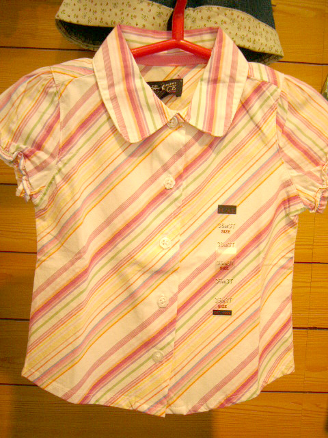 ピンクをメインにした斜めボーダーがおしゃれなストレッチのきいた半そでシャツ。袖口のフリルが女の子らしさを強調します。ボタンも花の形でとても手のこんだ作りです。