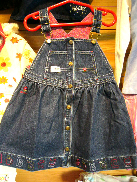 オシュコシュのデニムジャンバースカートです。何といってもスカート裾のABCや動物たちの刺繍がかわいいです。肩ひもは調節できますから、3歳くらいからのお子様でも着られそう。 Size: 4T(約100から110センチ)