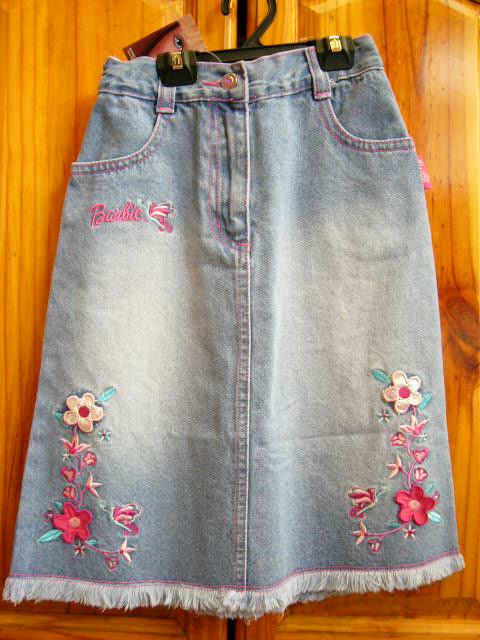 バービーのお花の刺繍がたくさんついたスカートです。すそがフリンジになっているのがポイントです。ウエストには、ピンクのガラス玉のようなボタンがついています。後ろがゴム入り。デニム素材と、花のモチーフがマッチしたお薦めの商品です。同デザインのデニムパンツ、Gジャンもぜひご覧下さい。