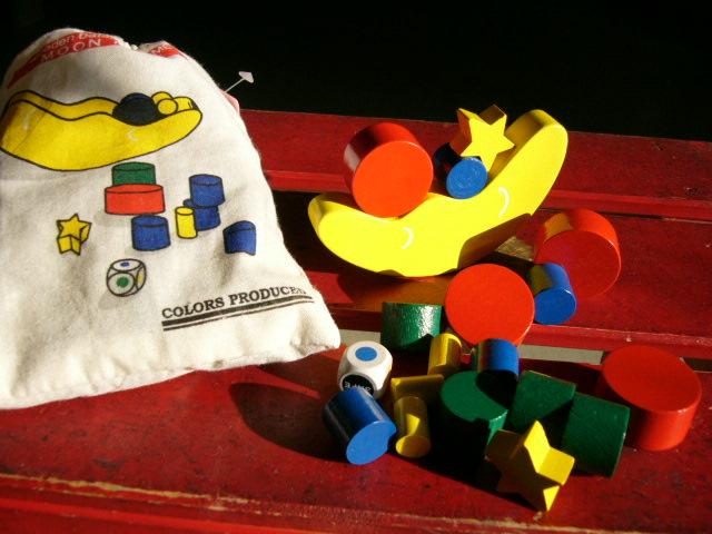 月の形をした木のブロック1個、サイコロ1個、その他に丸や星の形をした木のブロックが布袋に入っています。サイコロをふってでた色のブロックを月の上に積み重ねていきくずれたら負けです。バランス感覚を養うのに最適です。小さいものをそっとつかむ訓練にも。