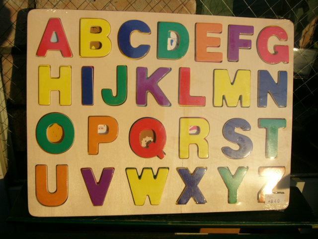 木製のABCのパズルです。AからZまでのカラフルなアルファベットをボードのくぼみにはめて遊びます。そのアルファベットで始まる絵がボードのくぼみにかくれています。例えば、Oは、オレンジのイラスト、Pはピッグのイラストとういうようになっています。