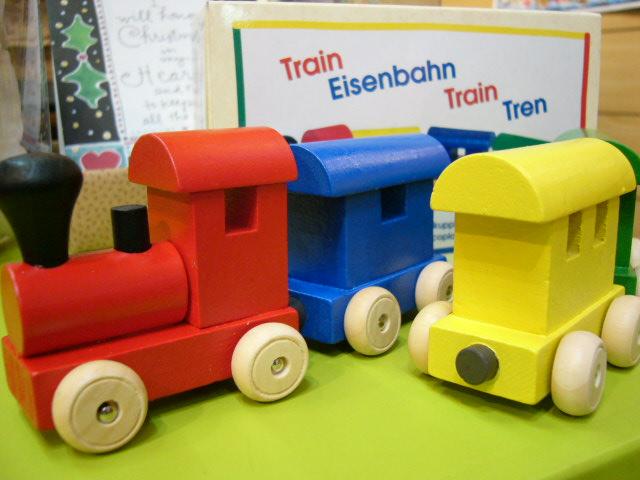 木製でできた4色の蒸気機関車セットです。連結部分はマグネットがついていて4つをつなげて遊ぶことができます。