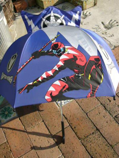 アメリカで人気のパワーレンジャーのかさです。かさの上部にはパワーの光線が飾りでついています。楽しい形のかさです。雨の日が楽しくなりそうです。