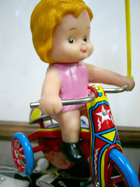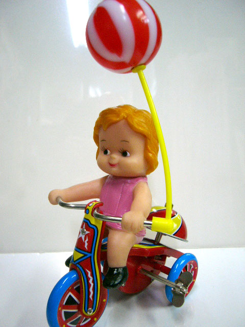 ブリキのぜんまい仕掛けおもちゃ 風船付き三輪車の少女