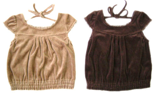 ちょっとシックな大人っぽいベロア風素材のベスト。後ろ肩にひもが付いていて、それを結ぶようになっています。とってもおしゃれで大人っぽいベストです。色はベージュとブラウン。
