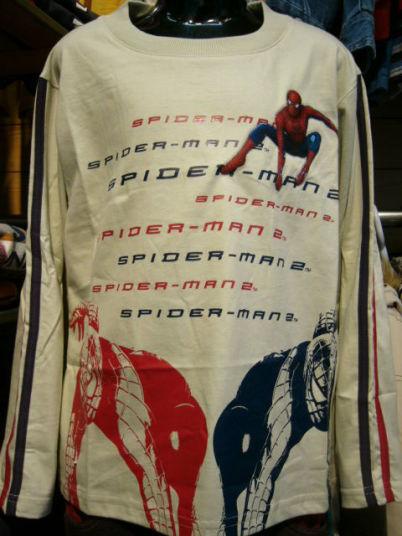 オリーブのボディカラーに赤と紺色の2本ラインが肩から袖にかけてアップリケされた長袖Tシャツです。スパイダーマンのビニールワッペンが胸元についています。ボディの色はオリーブといってもベージュに近い色で何にでも合わせやすい色です。
