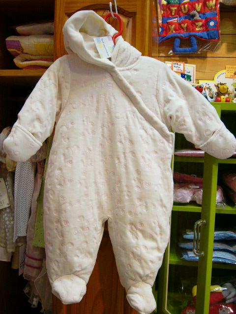 中綿入りでふかふかした手触りのロンパースです。白地にピンクのハート刺繍がかわいらしい。脇から足首までジッパーがあるのでおむつ替えも楽です。