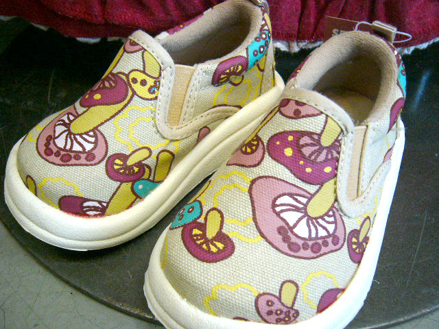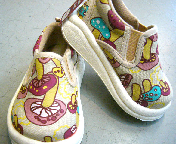 子供用スリッポンシューズ セサミクラブ きのこ柄ボップなピンクのきのこ柄がとってもキュートなちょっとレトロな雰囲気もするスリッポンシューズです。とても軽くてはきやすい。サイズは13から19センチまでございます。