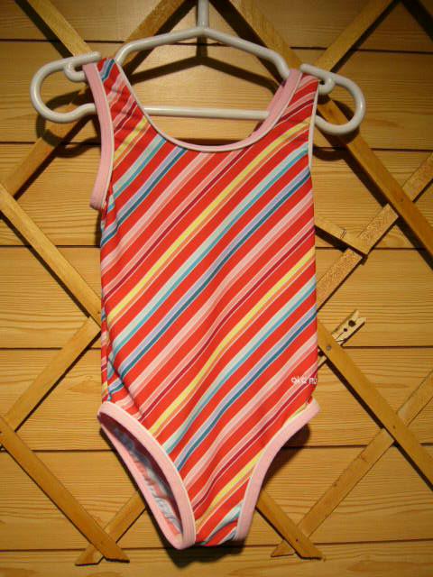オレンジをベースカラーとした斜めボーダープリントがめずらしい水着です。。